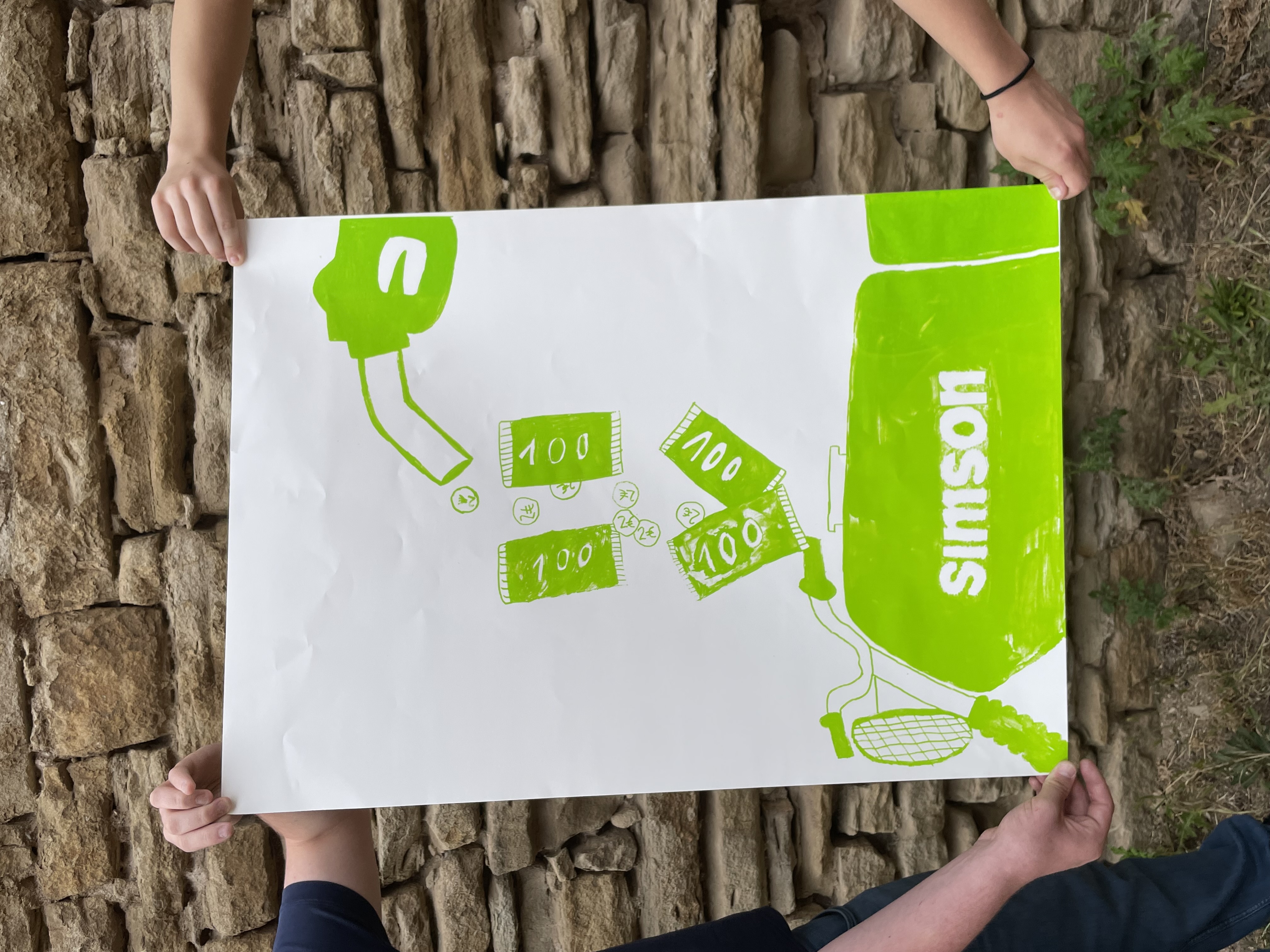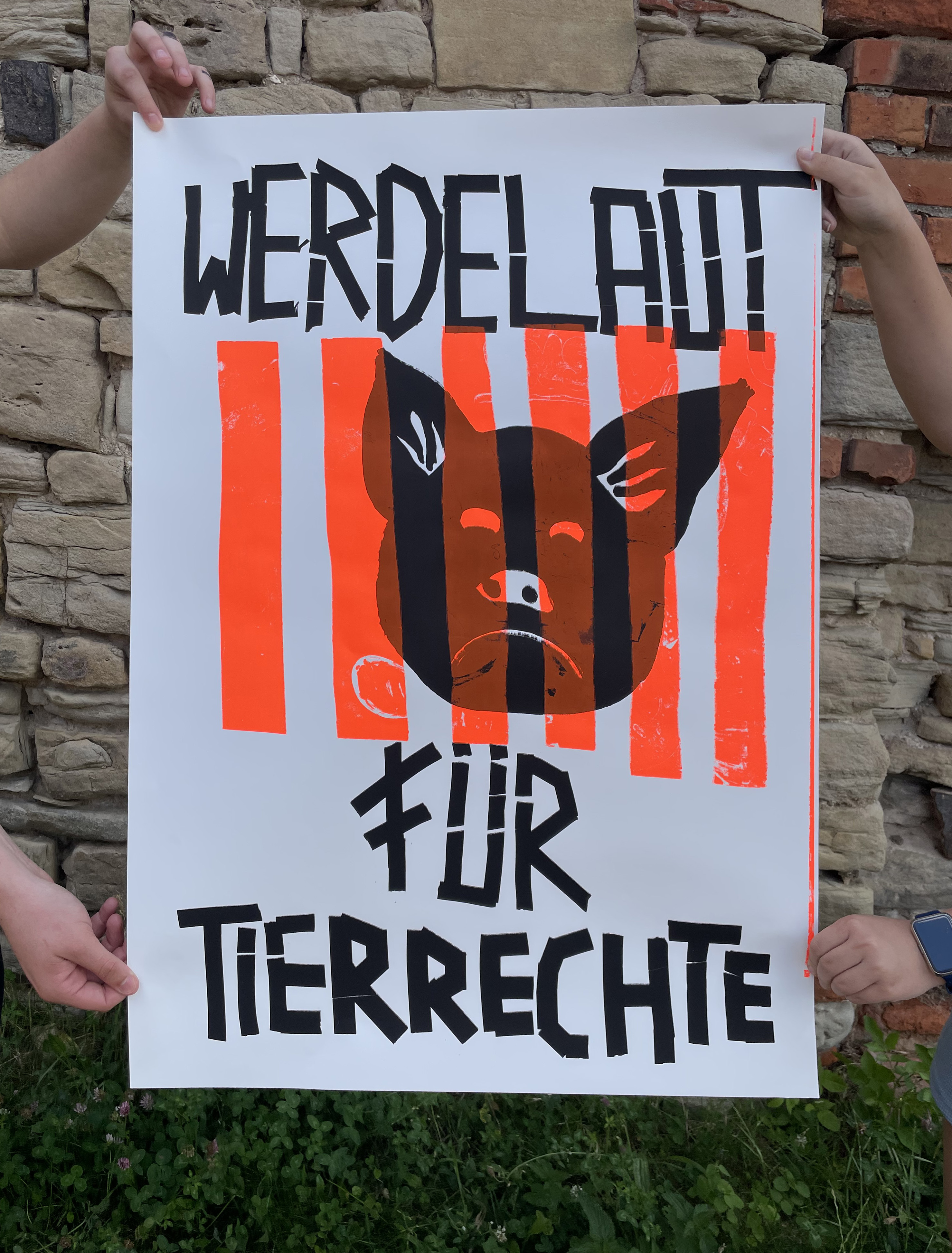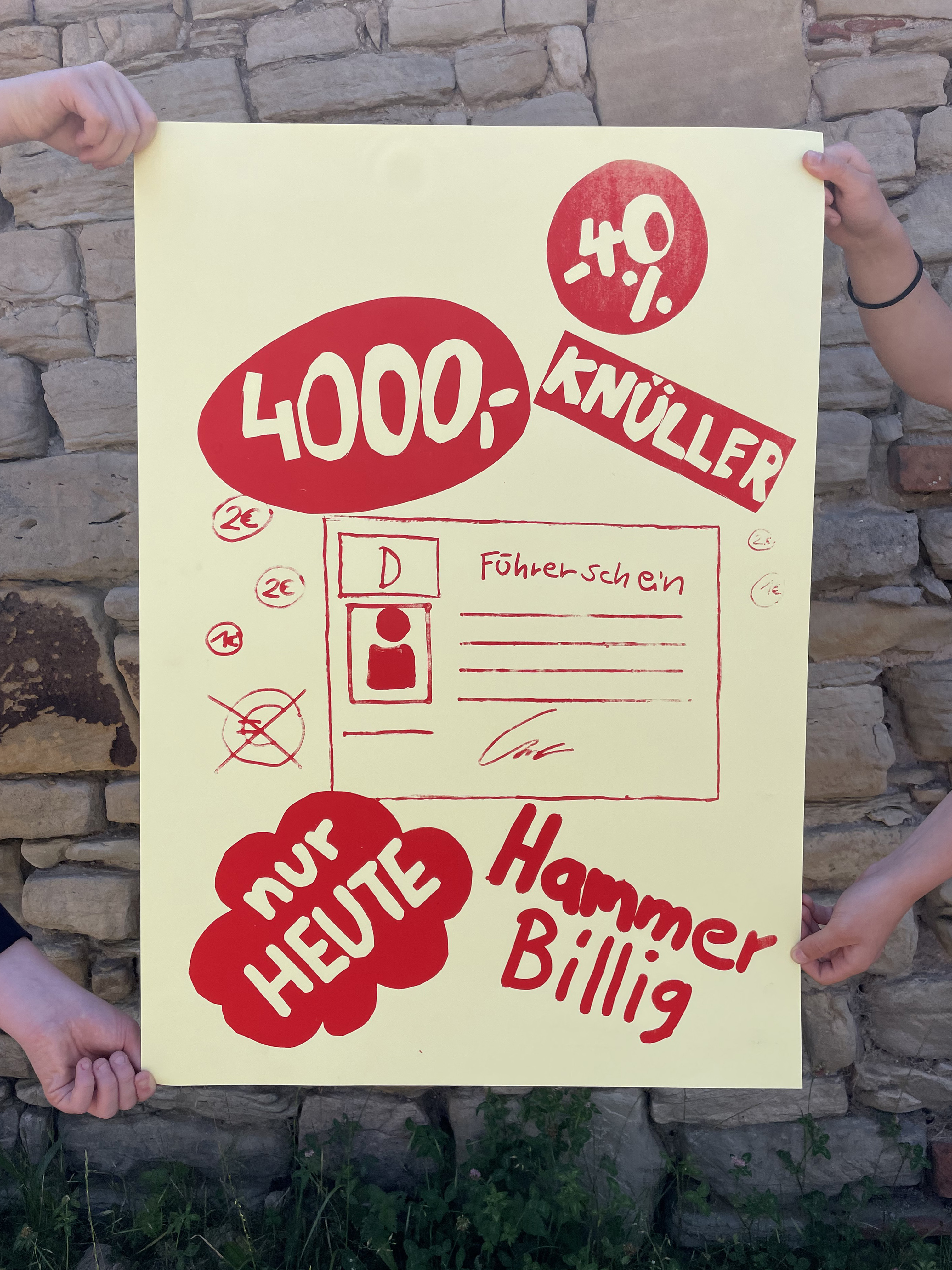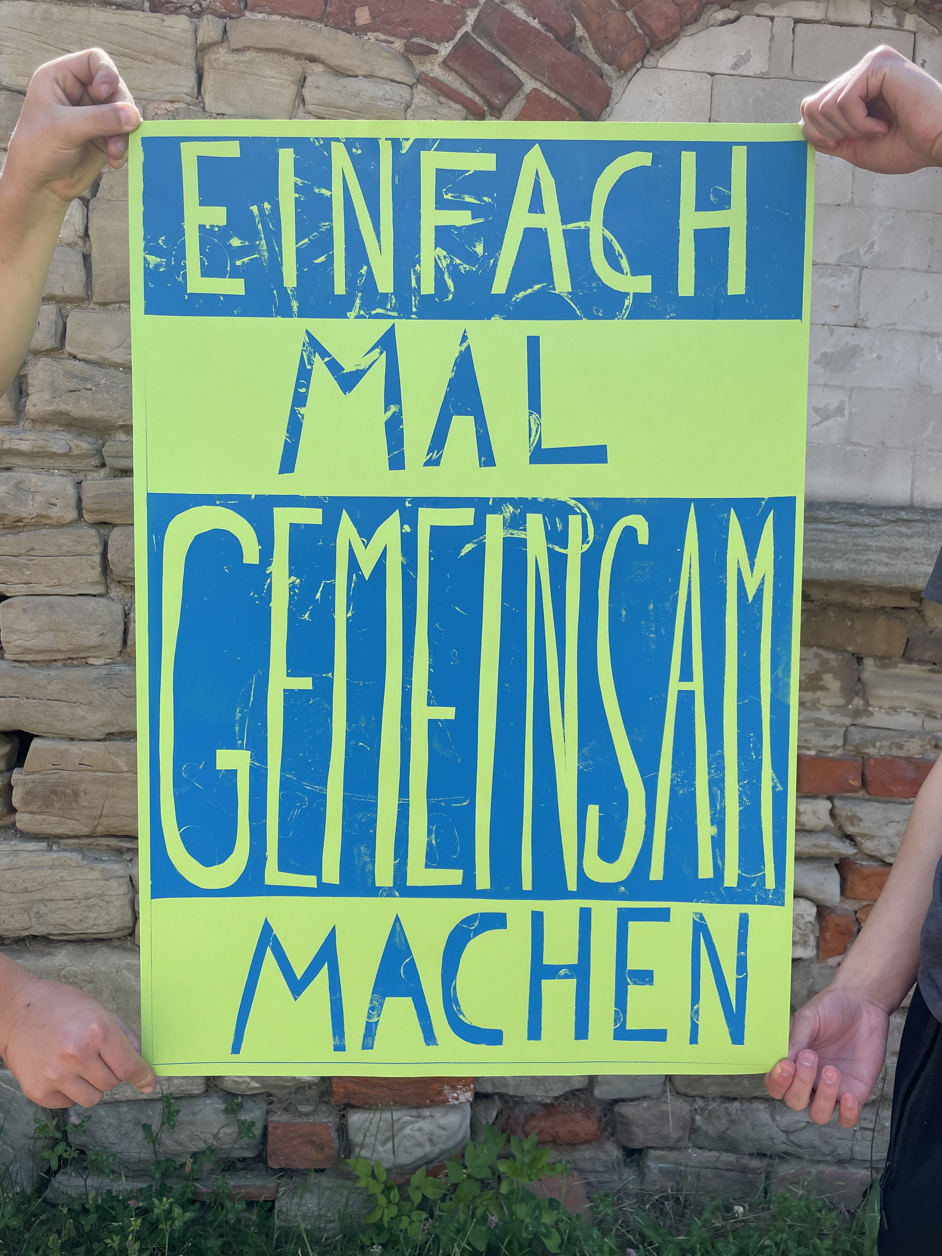 Für Workshops mit größeren Gruppen gab es nach Absprache einen Vorbereitungstermin, in dem Themen und Ziele des Projekts vorgestellt und bereits erste Plakatideen entwickelt wurden. Die vorbereiteten Ideen wurden dann am Tag des eigentliche Druckworkshops auf Posa weiterentwickelt, umgesetzt und gedruckt. Der Druckworkshop dauerte 5-6 Stunden.