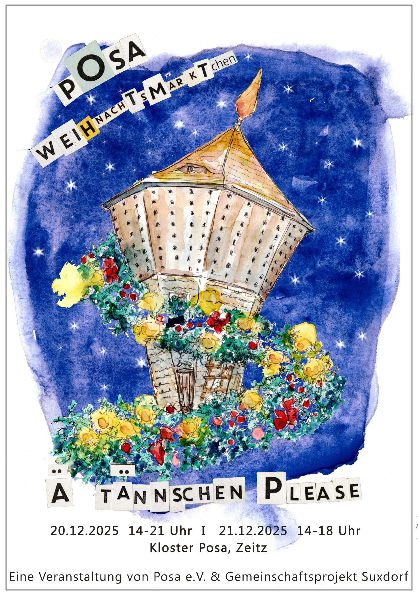 „Ä Tännschen please“ – zum dritten Mal öffnet das Weihnachtsmärktchen auf Kloster Posa seine Pforten! Dieses Jahr in Zusammenarbeit mit dem Gemeinschaftsprojekt Suxdorf. Es gibt Livemusik, Kunsthandwerk und Selbstgemachtes, Süßes und Herzhaftes, Kaffee und Glühwein und Geschichten am Lagerfeuer...